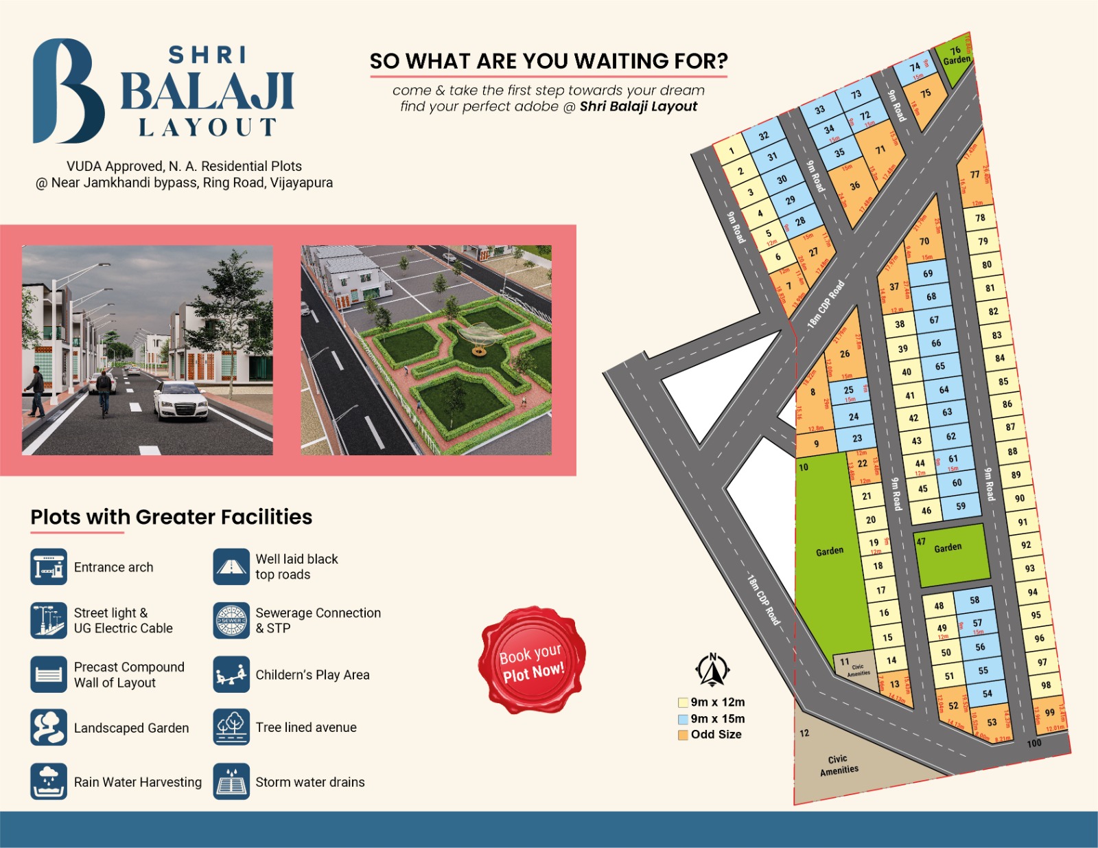 Shri Balaji Layout is a VUDA-approved residential project located near Jamkhandi Bypass, Ring Road, Vijayapura. This well-planned layout offers excellent connectivity and a modern living environment, making it an ideal choice for both home buyers and investors.